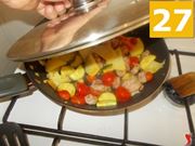Infine unite i pomodorini (25) alla padella, fateli cuocere qualche minuto aggiustando di sale e poi unite anche le salsicce (26), mescolando bene per amalgamare il tutto. Quindi coprite con un coperchio (27) e lasciate cuocere per circa dieci minuti o fino a quando la salsiccia non sarà cotta.