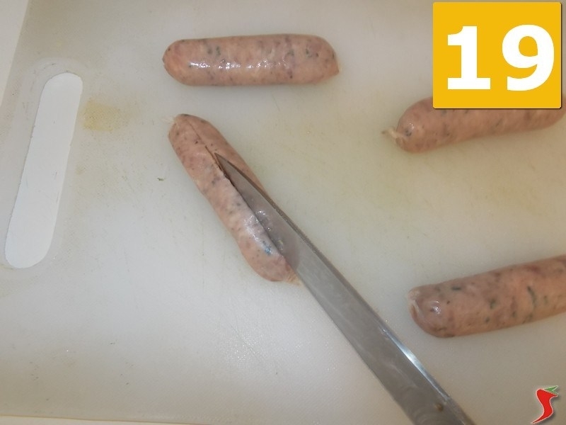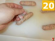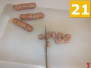 Prendete le salsicce e incidetele sul budello (19) con il coltello da carne. Quindi sfilate la carne dal budello (20) e tagliatela in pezzi (21). Ripetete l'operazione per tutte le salsicce e mettete tutto da parte.