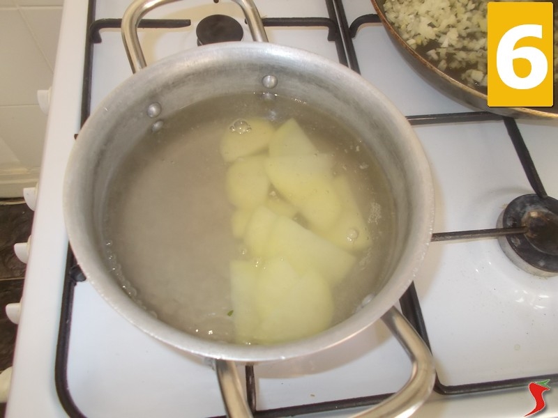 Quindi mettete le mezze fettine di patata in una ciotolina (4) a parte e proseguite. Nel frattempo avrete messo a bollire abbondante acqua salata in un tegame e una volta in ebollizione immergetevi le patate (5) per circa dieci minuti, fatele lessare (6) per questo tempo e nel frattempo proseguite con la ricetta.