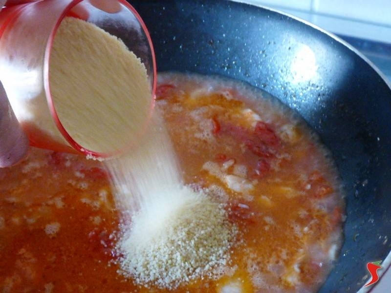 Un modo alternativo per preparare ancora più velocemente un gustoso piatto di cous cous è quello di cuocere la semola direttamente nel sugo di pesce.Per 4 persone occorreranno:250 grammi di cous cous a grana media300 millilitri di acqua calda salata500 grammi di pesce pulito (salmone, tonno, persico, gamberetti, coda di rospo o quello che preferite)4 cucchiai di olio extravergine d'oliva400 grammi di pomodoriniuno spicchio d'aglioprezzemolopaprikala scorza di mezzo limone