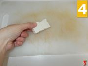 Prendete la feta e ponetelo sullo stesso tagliere utilizzato precedentemente (4), poi con un coltello dalla lama liscia, tagliuzzatelo a quadratini (5) ed una volta terminato anche questo passaggio, lasciatelo da parte su un piattino piano (6).