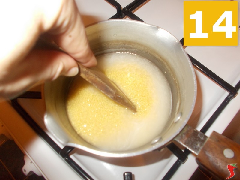 Aggiungete ora il cous cous senza aspettare che questa vada in ebollizione (13), aggiungete sale fino a vostro gradimento e mescolate accuratamente con un mestolo di legno (14), fino a quando non si sarà asciugata completamente tutta l'acqua della cottura (15).