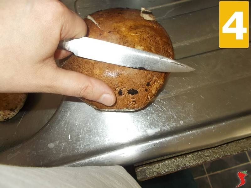 Ora pulite bene i funghi togliendo con il coltello a lama liscia la terra dai gambi e dai cappelli (4), strofinando con un panno umido e passando velocemente i funghi sotto l'acqua corrente se le operazioni precedenti non sono state sufficienti. Quindi disponeteli sul tagliere e iniziate a tagliarli a dadini (5) per poi metterli in una ciotolina (6) a parte.