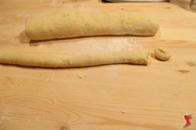 Amalgamare bene tutti gli ingredienti , quindi impastare bene mettendo sul piano di lavoro una spolverata di farina in modo tale che l’impasto non attacchi. Cercate di formare delle strisce di impasto, lavorando con il palmo della mano.