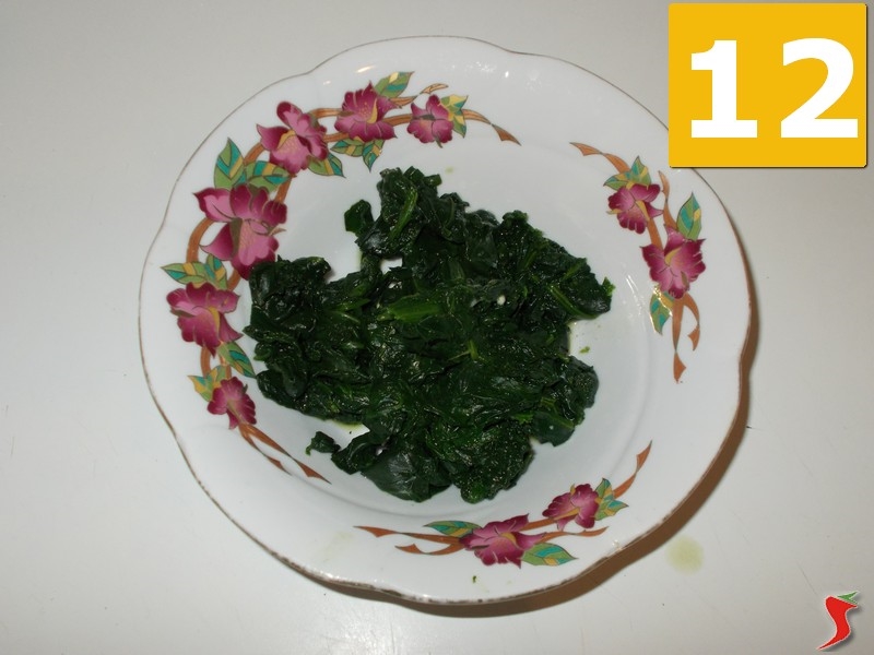 Poi riprendete gli spinaci e metteteli sul tagliere (10), dove li triterete grossolanamente (11) prima di metterli in una ciotolina (12) a parte.