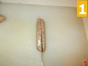 Cominciate la ricetta a partire dalle salsicce, che dovrete incidere (1) lungo il budello in modo da sfilarne poi via la carne (2) di maiale, che quindi taglierete in piccoli pezzi (3) da mettere su un piattino a parte.