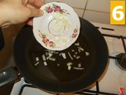 Poi sbucciate la cipolla e tritatela (4) finemente. Quindi versate cinque cucchiai di olio extravergine di oliva (5) in una padella ampia ed antiaderente e fateli scaldare bene a fuoco medio. Una volta caldo unite la cipolla tritata (6) a soffriggere finché non diviene trasparente.