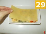 Quindi con un cucchiaio iniziate a prendere il ripieno per stendere uno strato (28) sopra la sfoglia. Una volta steso il primo strato poggiate sopra un'altra sfoglia (29) e di nuovo uno strato di ripieno (30).