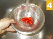 Quindi lavate con cura anche i pomodorini pachino (4) e poneteli sul tagliere asciutti. Divideteli in quarti ed eliminate l'acqua vegetale (5) per lasciare solo la polpa. Quindi mettete i pezzetti di polpa in un piattino (6) a parte.