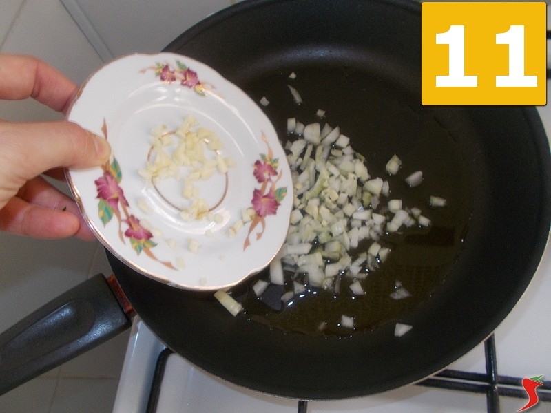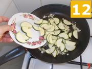 Una volta caldo l'olio unite la cipolla (10) e l'aglio (11) tritati e fate soffriggere quel tanto che basta per dorarli. Quindi unite anche le zucchine (12) per iniziare a cuocerle.