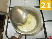 In questa ricetta si creerà una besciamella diversa dal solito, con il brodo al posto del latte. Quindi procedete come sempre facendo sciogliere il burro (19) in un pentolino a fuoco molto dolce. Una volta sciolto unite la farina (20) e mescolate bene con una frusta per creare il roux, un composto pastoso. Quindi iniziate ad unire il brodo ben caldo (21) e mescolate costantemente con la frusta al fine di far addensare la besciamella al punto desiderato.