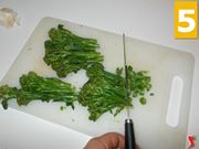 Una volta stiepiditi, mettete i broccoletti sul tagliere (4) e iniziate a tritarli finemente (5) con il coltello grande a lama liscia. Quindi mettete tutto in una scodella (6) a parte e proseguite con la preparazione.