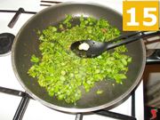 Quindi aggiungete alla padella anche i broccoletti (13) e fateli insaporire qualche minuto, mescolandoli spesso (14). Lasciate a fiamma bassa per dieci minuti e poi spegnete il fuoco. In ultimo, eliminate lo spicchio d'aglio (15).