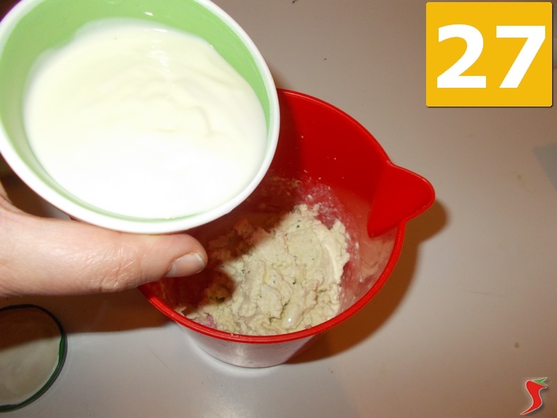 Quindi versate 15g di pinoli nella panna (25), lasciando il resto per la fase successiva. Poi prendete il minipimer e frullate il tutto (26), per ottenere una crema molto densa, in cui poi verserete la besciamella pronta (27).