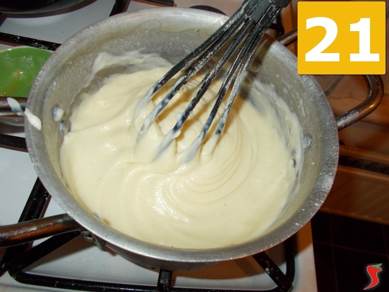 Quindi prendete una frusta e iniziate a sbattere il burro con la farina (19), in modo da avere il roux, una preparazione molto densa e gialla da cui partire per la besciamella. Appena sarà pronta, iniziate a versarci sopra, lentamente, il latte caldo (20), continuando a mescolare con la frusta, fino ad ottenere la besciamella (21) densa e cremosa. Infine, spegnete il fuoco e iniziate a preparare gli altri ingredienti.
