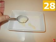 Ora prendete una piccola pirofila e stendetene sul fondo un pochino di besciamella (28) per non far attaccare la pasta. Quindi stendete un foglio di pasta (29) sulla besciamella. Infine riversate tutta la besciamella (30) nella padella con spinaci e pomodorini, e spegnete il fuoco.