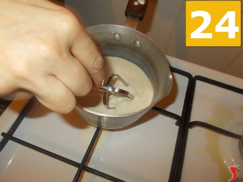 Una volta ottenuto il roux versateci dentro il latte (22) che avevate precedentemente scaldato bene e spolverato con della noce moscata. Continuate a mescolare con la frusta (23) fino ad ottenere la densità desiderata (24).