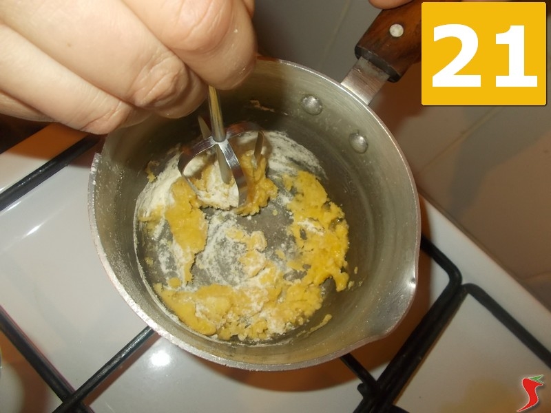 Nel frattempo dedicatevi alla besciamella facendo sciogliere il burro (19) in un pentolino a fuoco molto dolce. Unite poi la farina (20) passandola in un setaccio. Mescolate bene con una frusta per ottenere il roux (21).