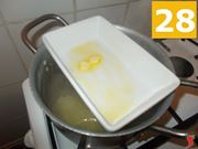 Nel frattempo avrete messo un pentolino di acqua salata a bollire. Una volta in ebollizione, metteteci i gamberetti (16) a lessare per cinque minuti. Una volta pronti, scolateli (17) e quindi trasferiteli in una ciotolina (18).