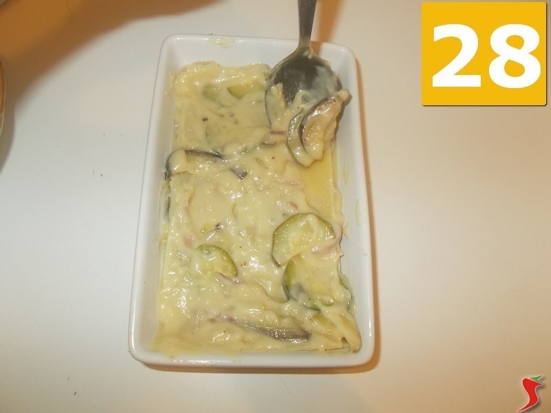 Infine sopra l'ultima sfoglia di pasta stratificate l'ultima porzione di ortaggi e besciamella (28) rimasta, quindi infornate (29) in forno preriscaldato a 180°C per 30 minuti, quindi sfornate (30) e servite subito in tavola ben caldo.