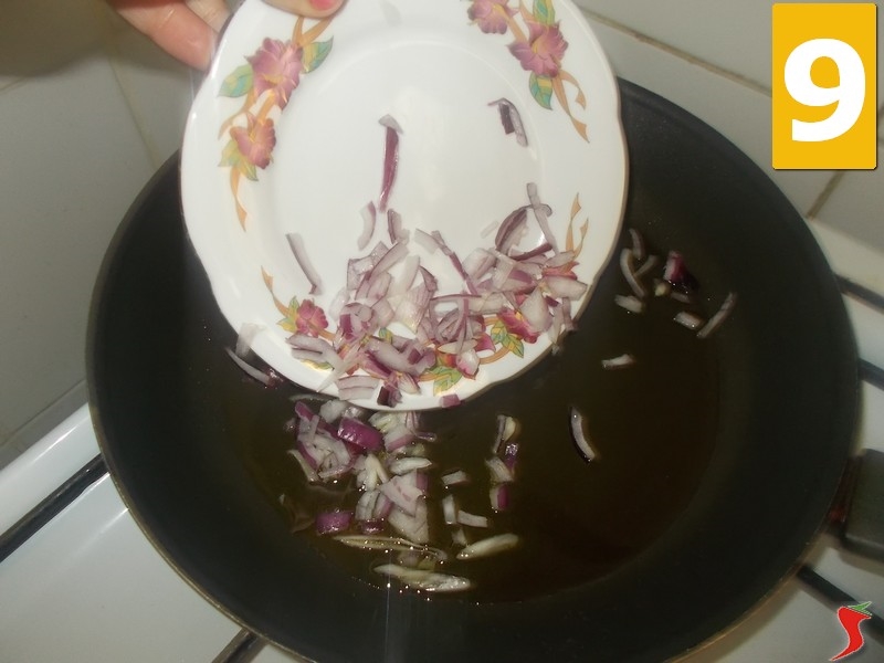 Ora sbucciate la cipolla e tritatela (7) finemente. Poi versate sette cucchiai di olio extravergine di oliva (8) in una padella ampia ed antiaderente a scaldare a fuoco medio. Una volta caldo unite alla padella anche la cipolla tritata (9) per farla soffriggere finché non diviene trasparente.