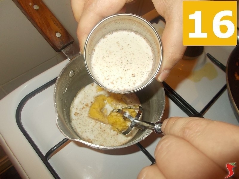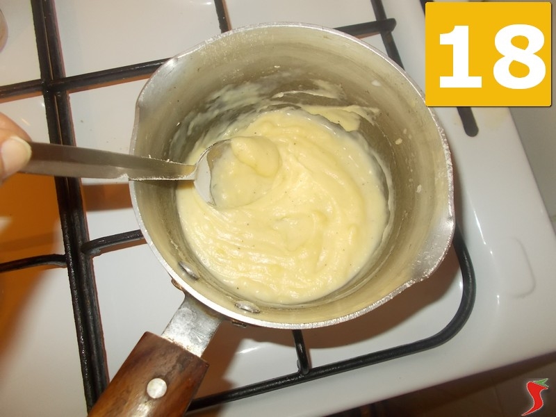 Nel frattempo unite la noce moscata al latte, che scalderete bene prima di versarlo (16) nel pentolino per sciogliere il roux con la frusta (17) e cominciare a far condensare la besciamella fino al punto giusto (18) con una consistenza molto cremosa.