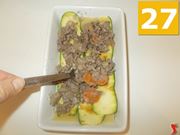 Ora imburrate il fondo di una pirofila e quindi stendete sul fondo un pochino di ripieno. Quindi stendeteci sopra una sfoglia di pasta (25) e poi stendeteci sopra qualche fettina di zucchina (26). Infine mettete sopra la zucchina il ripieno di carne e besciamella (27) e coprite ancora con una sfoglia di pasta.