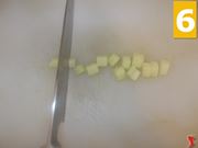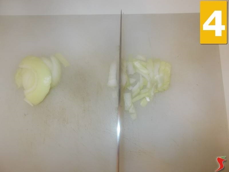 Quindi preparate gli ingredienti per il soffritto, sbucciando la cipolla per tritarla (4) finemente. Quindi tagliate a rondelle fini la carota (5) e infine lavate bene il sedano per tagliarlo (6) in piccoli pezzi.