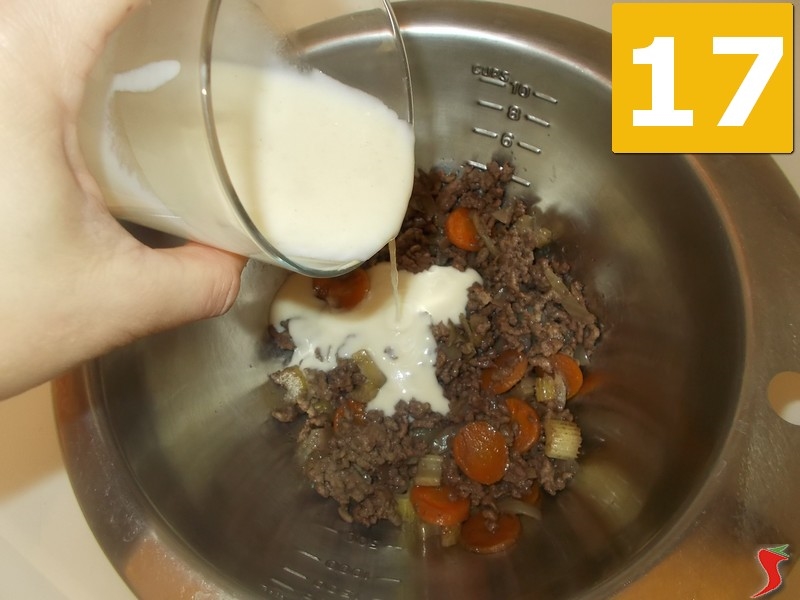 Ora mettete la carne macinata con il suo soffritto in una planetaria (16) e quindi versateci dentro la besciamella (17) e mescolate bene per amalgamare (18) il tutto.