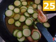 Dopo circa 5, massimo 10 minuti di cottura (24), estrarre i gamberi dalla padella (25) e lasciare in cottura solo le zucchine (26), per almeno 15 minuti.