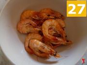 Ora che i gamberi sono cotti (27), si può iniziare a ripulirli, togliendo la testa e il guscio (28), fino a quando non si è terminata tutta la quantità necessaria alla ricetta (29).