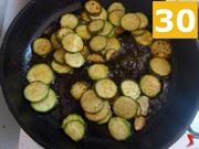 Appena le zucchine sono pronte (30), si potranno aggiungere nuovamente i gamberi sgusciati precedentemente (31), e lasciar cuocere insieme per altri 5 minuti (32).