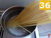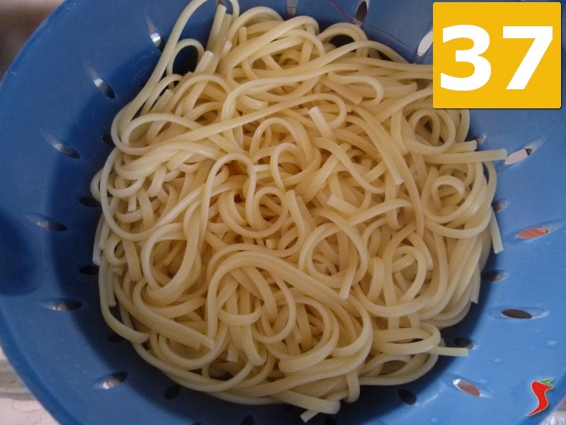 Ora che il condimento è pronto, si può procedere con la cottura della pasta. Quindi, prendere le linguine nella quantità necessaria alla ricetta (35) e versarle in una pentola piena di acqua almeno fino alla metà quando questa giunge ad ebollizione (36) e lasciar cuocere per il tempo necessario. Salare quanto basta. Appena la cottura sarà terminata, colare la pasta (37).