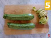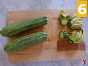 Per iniziare la preparazione di questa ricetta, possiamo partire con il pulire le zucchine, le quali vanno prima lavate, poi le si ripone su di un tagliere (4), e si tagliano le estremità (5) da entrambi i lati (6).