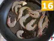 Dopo aver lasciato soffriggere per qualche minuto olio e aglio, si possono aggiungere i gamberi (16) e poi piano piano le zucchine (17) fino a riporle tutte nella padella (18).