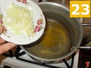 Ora iniziate il soffritto mettendo il burro in un tegame (22) per farlo fondere, e una volta fuso, metteteci a soffriggere la cipolla tritata (23) e il porro (24).