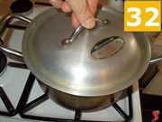 Date una mescolata sommaria (31) e quindi chiudete con il coperchio (32) lasciando cuocere con il fuoco al minimo per circa 45 minuti, finché le patate non sono ben cotte. Una volta pronto, aggiungete anche il riso (33) a cuocere.