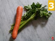Procedete ora con i sedano nello stesso modo in cui avete fatto per le carote. Quindi, lavate accuratamente il sedano e riponetelo su di un tagliere (8), poi tagliate la parte superiore con le foglie utilizzando, quindi, solo il gambo, il quale dovrà essere tagliato in tanti piccoli pezzi (9).