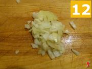 Ora continuate con la cipolla: posizionatela su di un tagliere (10), iniziate a tagliarla in due metà e poi privatela della sfoglia esterna (11). Infine, tritatela finemente (12).