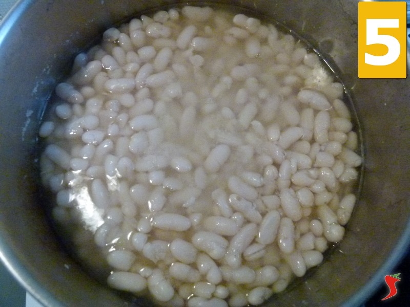 La ricetta della minestra di fagioli va iniziata con largo anticipo rispetto al momento in cui si desidera servirla. Innanzitutto i fagioli vanno messi a bagno già dalle 24 ore precedenti, così da consentire l’ammorbidimento degli stessi e facilitarne la cottura. Il giorno seguente, poi, si potranno estrarre i fagioli dall’acqua e riporli in acqua nuova (4), posizionandoli sul fornello a fiamma alta attendendo l’ebollizione. Appena raggiunta l’ebollizione, abbassare la fiamma e lasciare i fagioli in cottura per almeno due ore posizionando un coperchio sulla pentola (5).