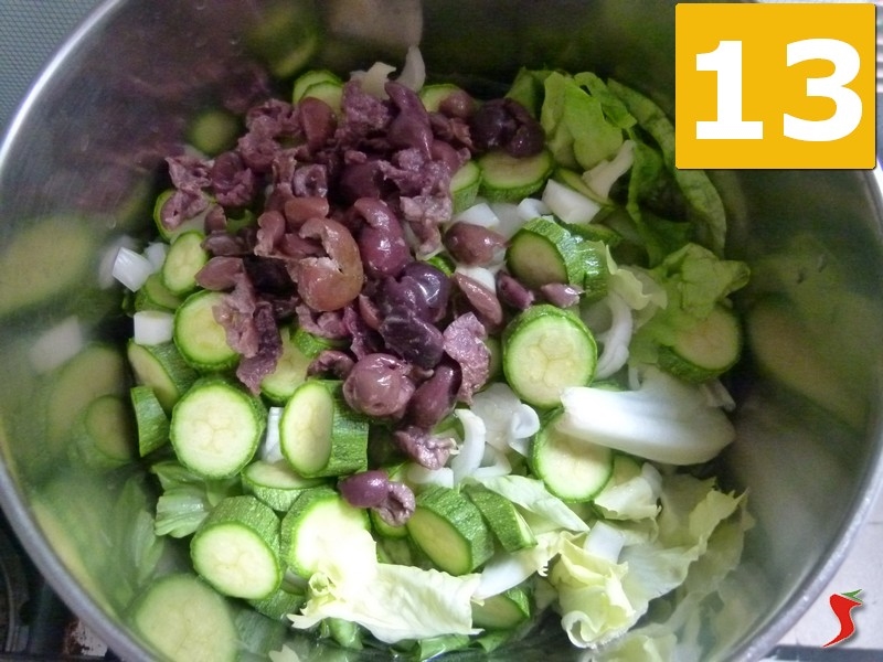 Infine, lavare anche la scarola (12). Appena le verdure saranno pronte, lavate e tagliate, si può procedere con la cottura della minestra. Quindi, prendere una padella capiente e dai bordi molto alti ed aggiungere al suo interno dell’acqua e tutte le verdure necessarie a questa ricetta, ovvero le scarole, le zucchine, la cipolla e le olive (13). Successivamente, quanto tutte le verdure saranno all’interno della pentola con l’acqua, riporre il tutto sul fornello a fiamma vivace e attendere che l’acqua arrivi ad ebollizione. Per facilitare il processo, oltre alla fiamma alta del fornello, coprire la pentola con un coperchio. Raggiunta l’ebollizione, salare quanto basta e lasciar cuocere la minestra a fiamma bassa (14), ma sempre mantenendo la pentola coperta.