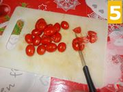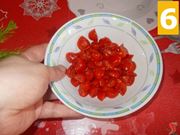 Intanto che i pistacchi si raffreddano, iniziate a trattare i pomodorini pachino, lavandoli bene (4) sotto l'acqua corrente. Quindi metteteli sul tagliere e tagliateli (5) in due, o quattro parti, se molto grossi. Quindi mettete tutto in una ciotolina a parte (6) e continuate la ricetta.