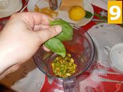 Ora che i pistacchi si sono raffreddati, iniziate a sbucciarli (7), operazione che dovrebbe essere resa molto semplice dalla bollitura. Una volta sbucciati, metteteli in un frullatore (8), in cui metterete anche le foglie di basilico ben lavate (9).