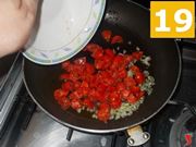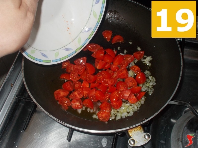 Quindi ora metterete i pomodorini pachino in padella (19) a cuocere. Fate andare per dieci minuti, in modo da far appassire i pomodorini e quindi aggiustate di sale (20). Lasciate cuocere con il coperchio a fiamma media per altri 5 minuti e quindi mettete la fiamma al minimo, per versare tutto il pesto di pistacchi (21) nella padella.
