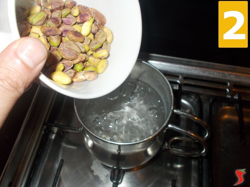 Mettete subito un pentolino con dell'acqua sul fuoco per farla bollire, e quindi iniziate la ricetta sbucciando tutti i pistacchi (1). Togliete il guscio e metteteli da parte, in attesa che l'acqua bolla. Una volta tolti i gusci, mettete i pistacchi nell'acqua bollente (2), e continuate a far bollire per circa 5 o 10 minuti, il tempo che i pistacchi si ammorbidiscano e quindi la pelle si stacchi. Una volta bolliti, scolateli (3) e fateli raffreddare.