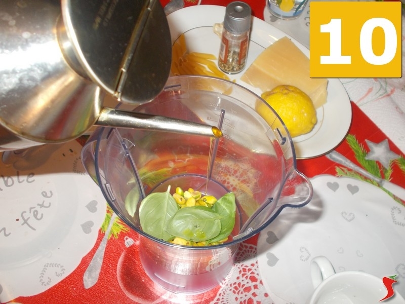 Quindi, versate nel frullatore anche 50 ml di olio extravergine di oliva (10), e grattateci dentro un pochino di scorza di limone (11), non trattato e lavato. Quindi grattate il parmigiano e mettetelo nel frullatore (12) con il resto degli ingredienti.