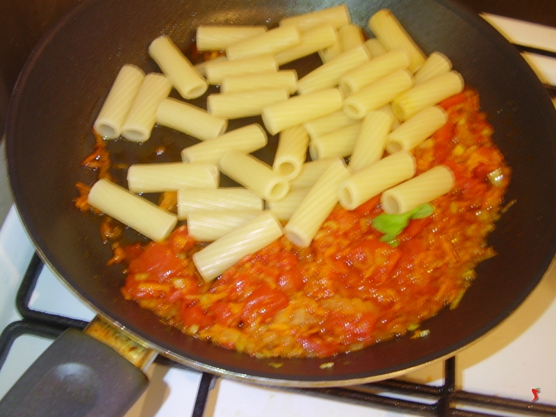 Nel frattempo avrete messo a bollire l'acqua per cuocere la pasta. Una volta pronti i rigatoni scolateli e saltateli nella padella con il sugo a fuoco moderato, mescolando bene per amalgamare il tutto. Aggiungete quindi anche il parmigiano, mescolate bene e impiattate ben caldo per servire in tavola.