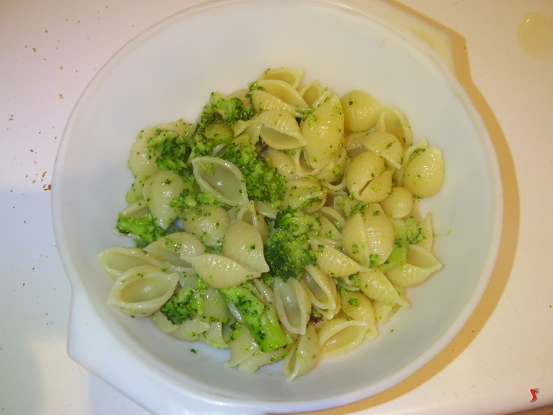 Mettete a bollire abbondante acqua salata e quindi lessate i broccoli per circa dieci minuti. Una volta cotti non scolate l'acqua, che servirà per cuocere la pasta, ma tirate via gli broccoli con un mestolo bucato e poggiateli su un tagliere. Quindi tagliate le cime in piccoli pezzi.