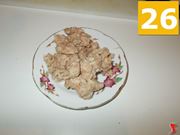 Quindi tagliate la carne delle salsicce (25) in pezzi piccolini, e metteteli su un piattino (26) a parte. Poi iniziate il soffritto, versando cinque cucchiai di olio extravergine di oliva (27) dentro una padella ampia e antiaderente.