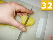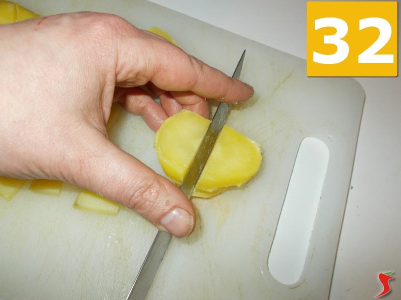 Nel frattempo che la salsiccia rosola, riprendete le patate ormai fredde e mettetele sul tagliere. Con il coltello prima affettatele (31) e poi tagliatele a cubetti (32). Mettetele in una ciotolina (33) a parte e proseguite la ricetta.